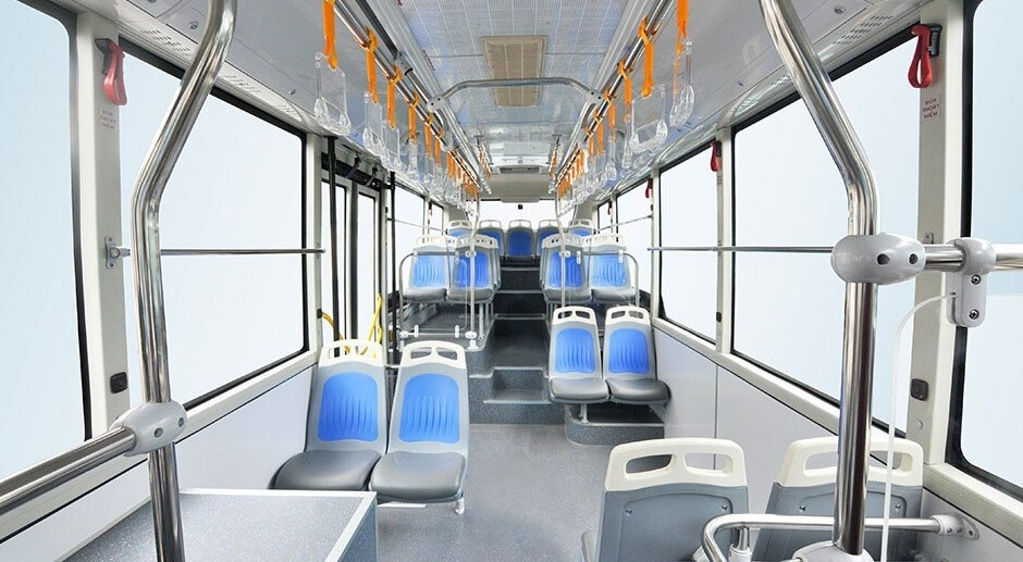 Nội thất xe nổi bật với phong cách tinh giản nhưng tiện nghi và sang trọng, trần và hông xe sử dụng tấm ốp bề mặt Aluminum, máng gió sử dụng hợp kim nhôm. Khoang hành khách chú trọng yếu tố không gian, kính hông được thiết kế liền nhau cho tầm quan sát rộng và thoáng. Sàn thấp mang đến cảm giác không gian nội thất rất rộng, thoáng đãng hiện đại Hệ thống tay nắm treo dành cho hành khách chắc chắn, màu sắc tươi tắn năng động, nổi bật dễ nhận biết.